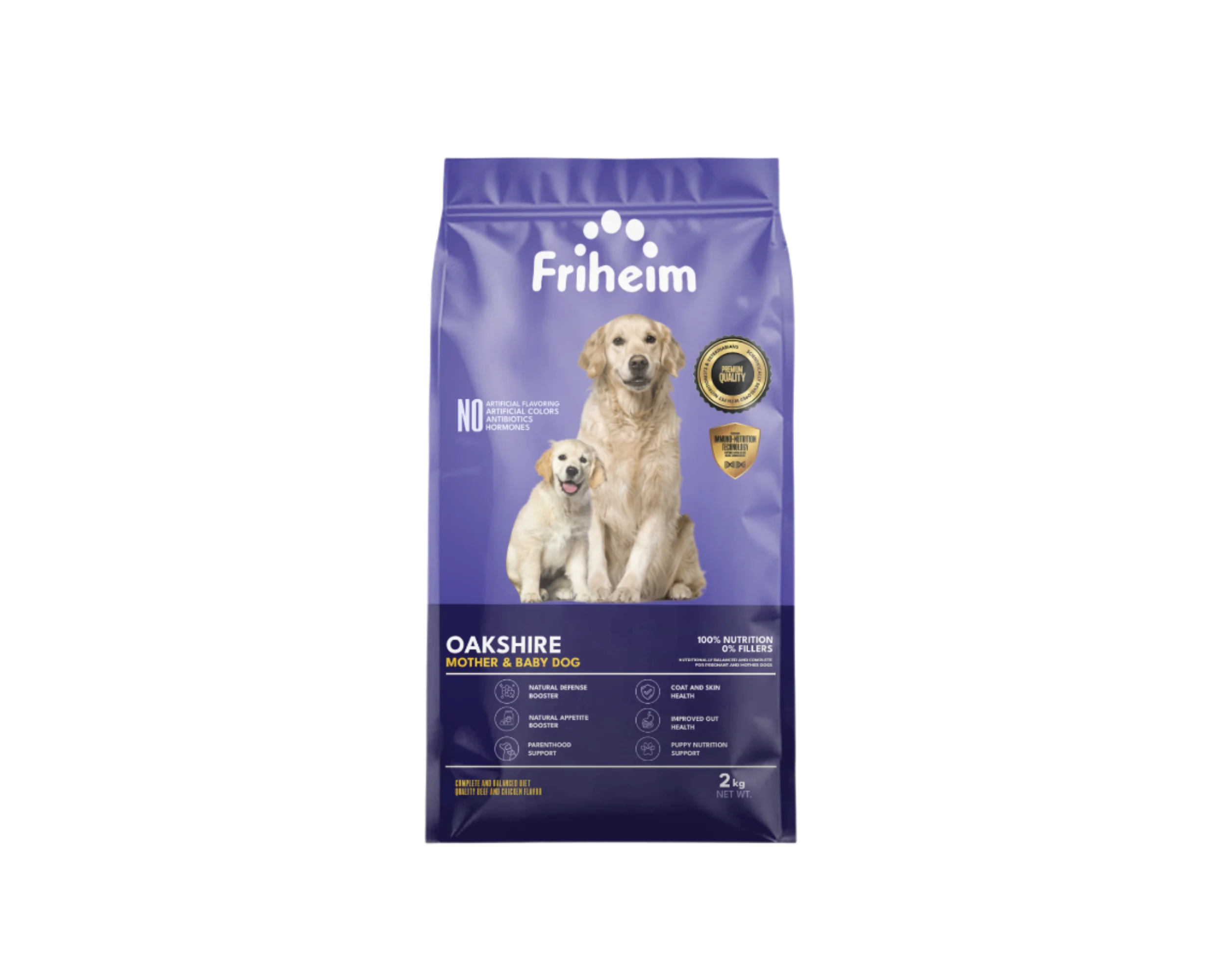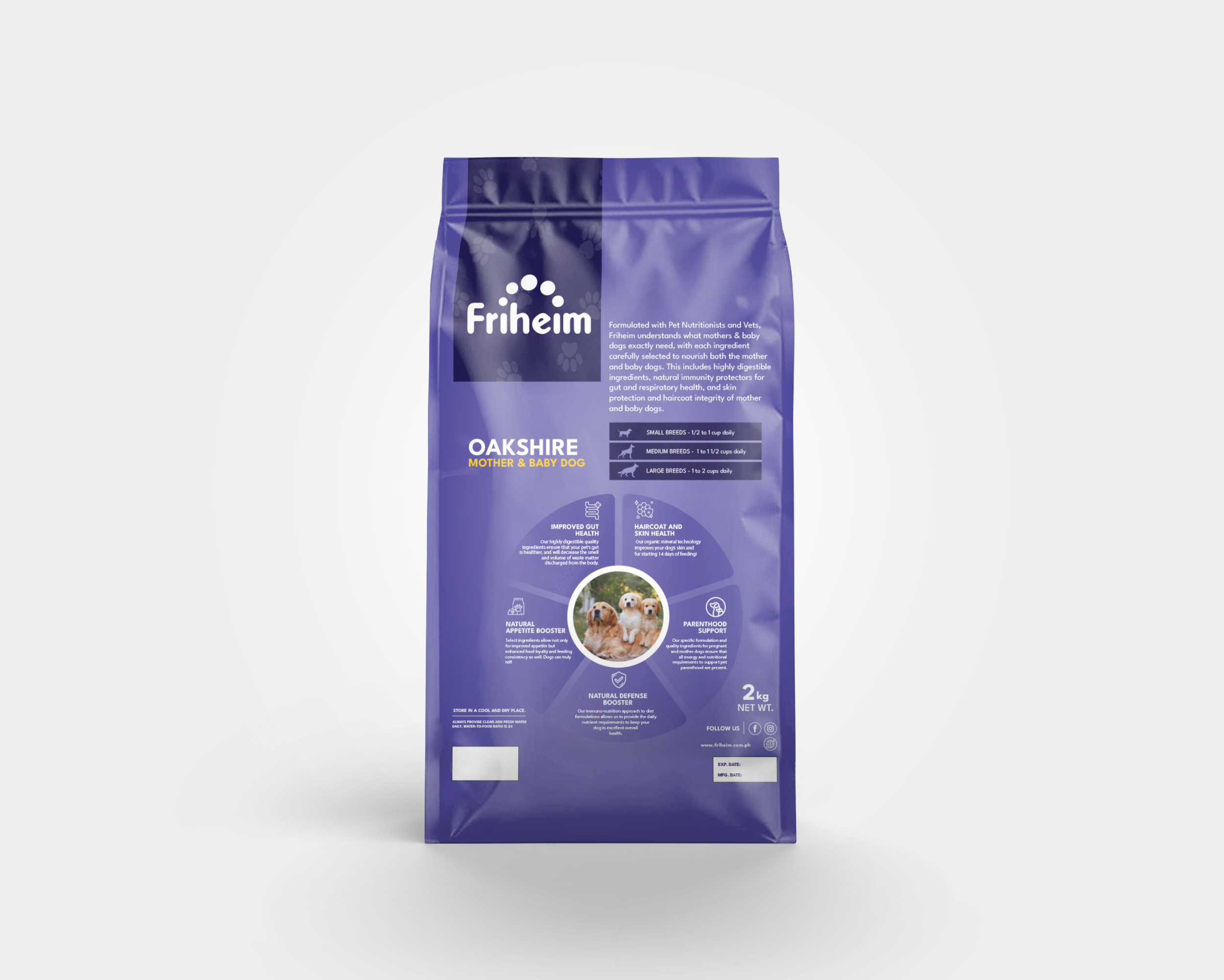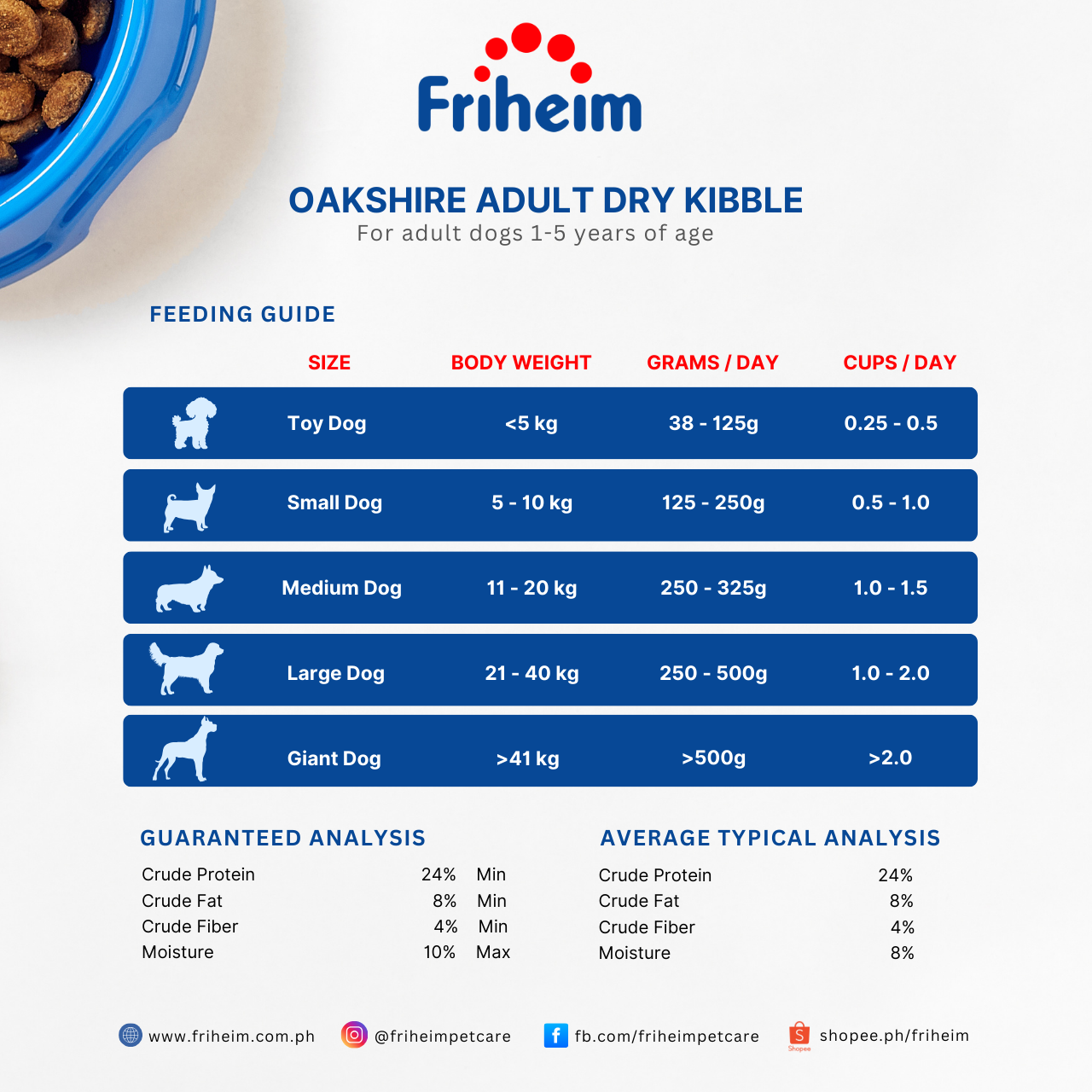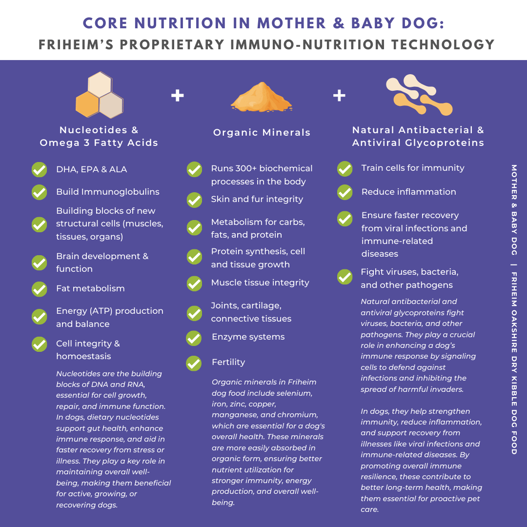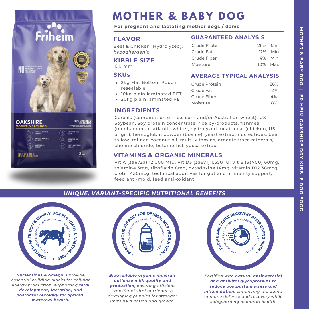 Yes! Friheim Oakshire dry kibble dog food is formulated for dogs of all breeds and sizes, ensuring they get the essential nutrients and protection against viruses and common diseases thanks to Friheim's proprietary Immuno-Nutrition Technology. Check the feeding guide in each product page of this website to find the appropriate life stage and right portion based on your dog's body weight.