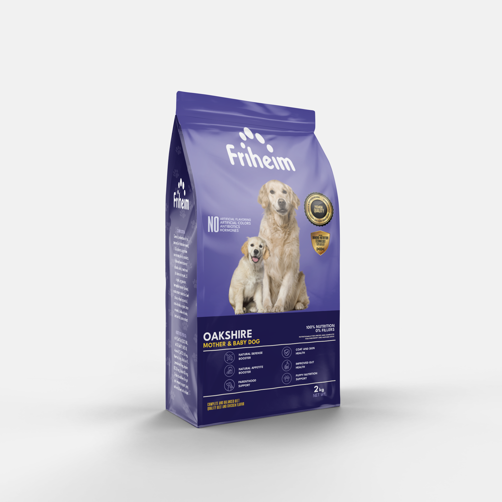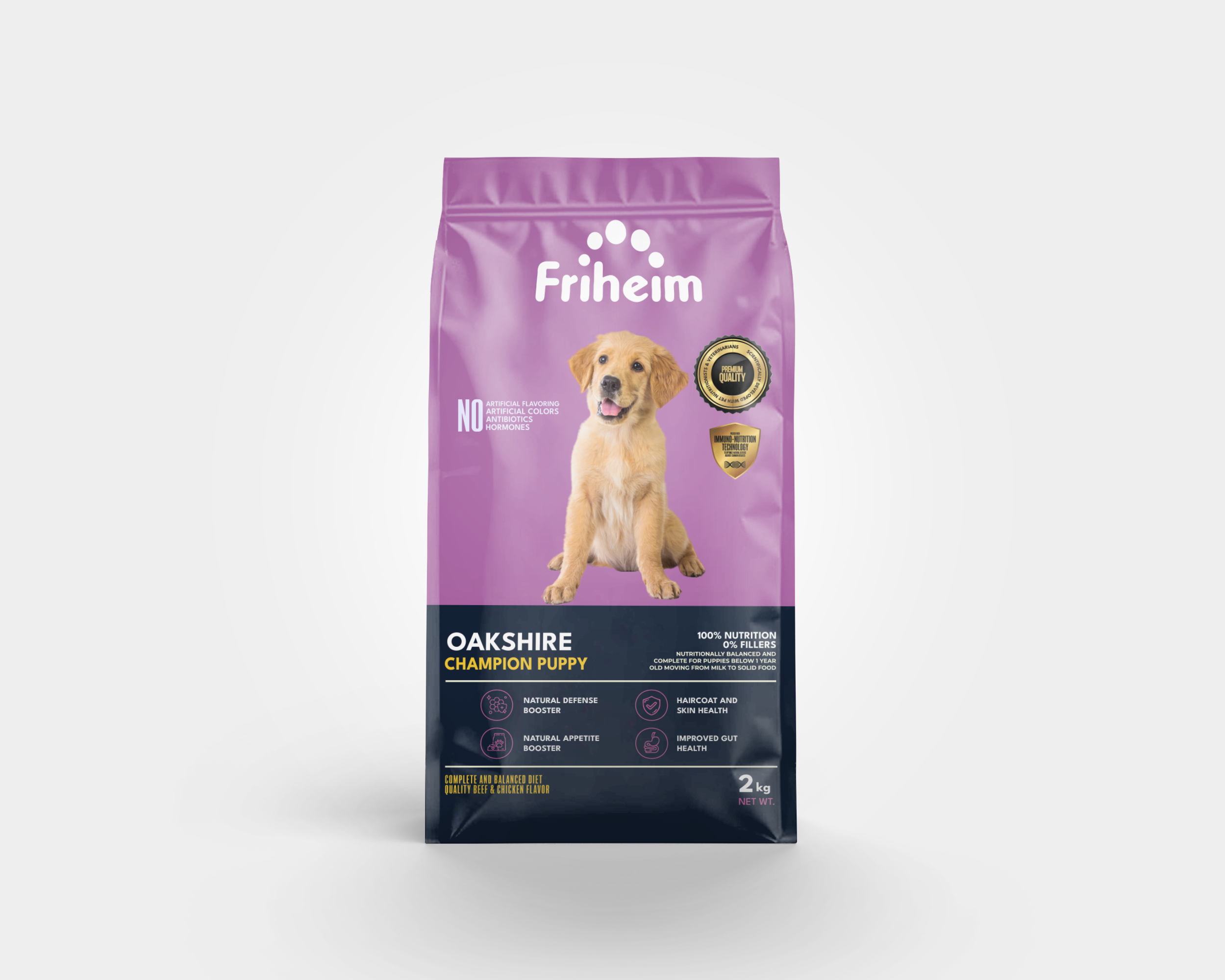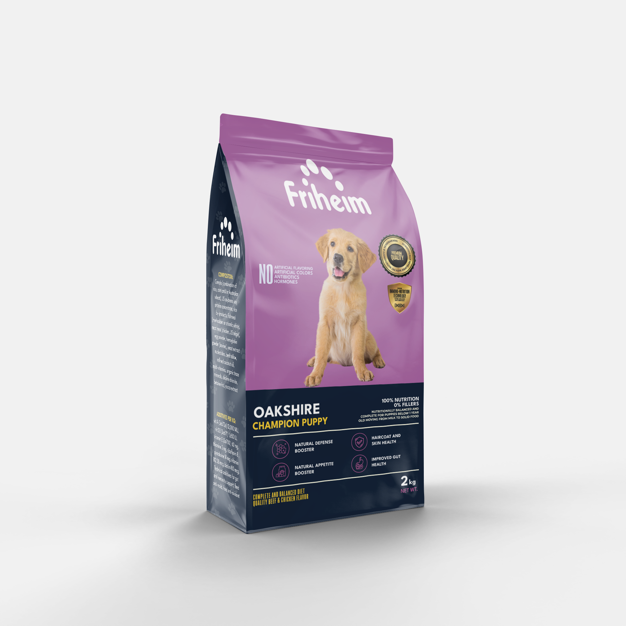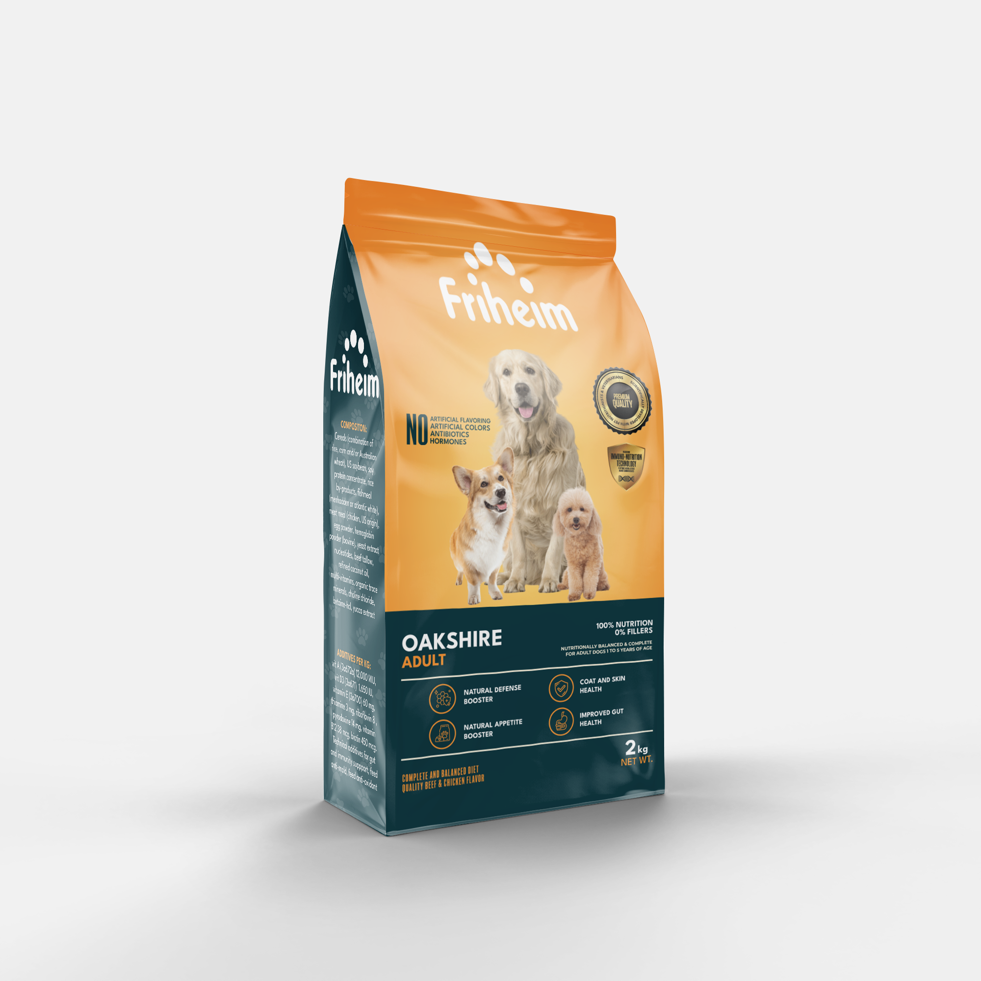 Yes! Friheim Oakshire dry kibble dog food is formulated for dogs of all breeds and sizes, ensuring they get the essential nutrients and protection against viruses and common diseases thanks to Friheim's proprietary Immuno-Nutrition Technology. Check the feeding guide in each product page of this website to find the appropriate life stage and right portion based on your dog's body weight.