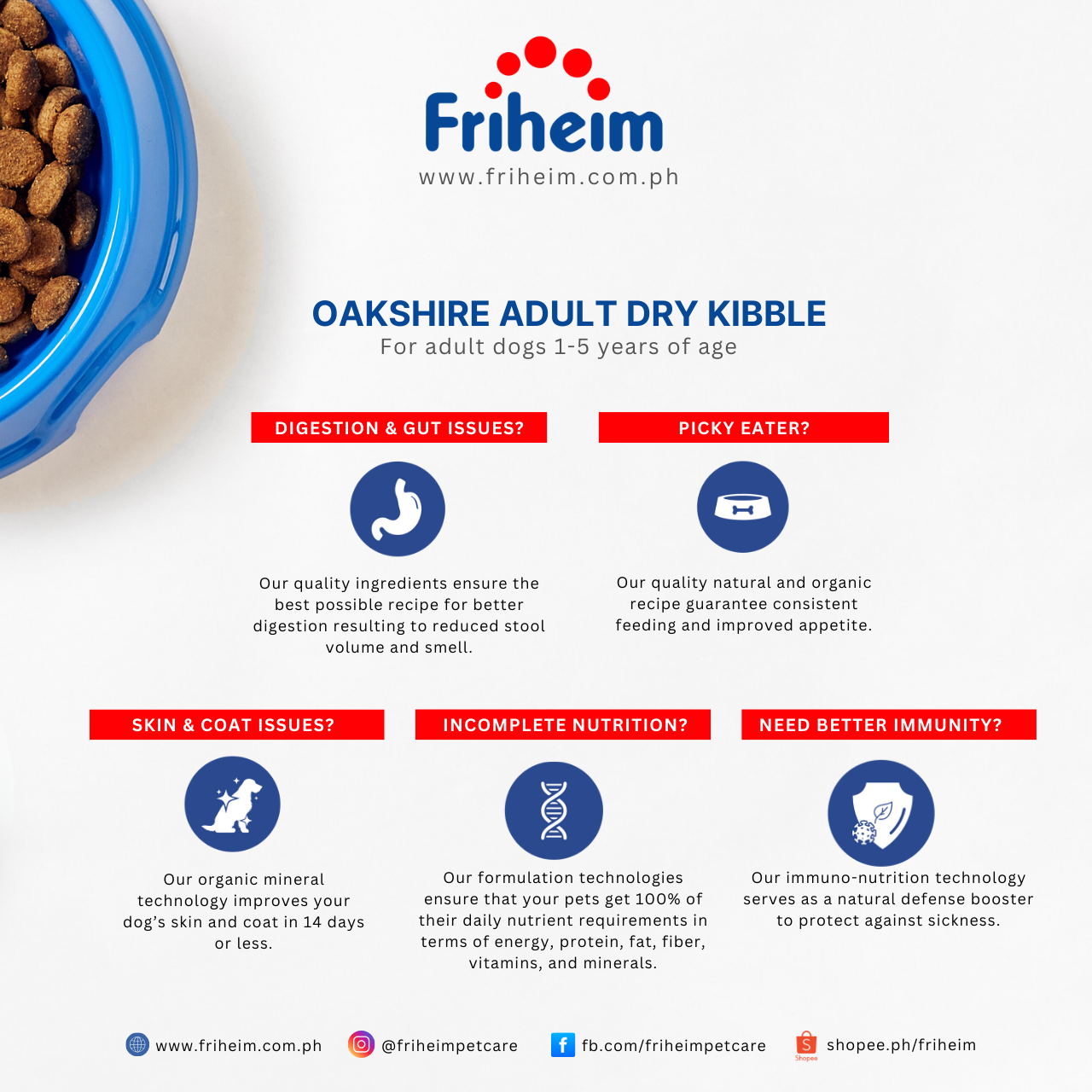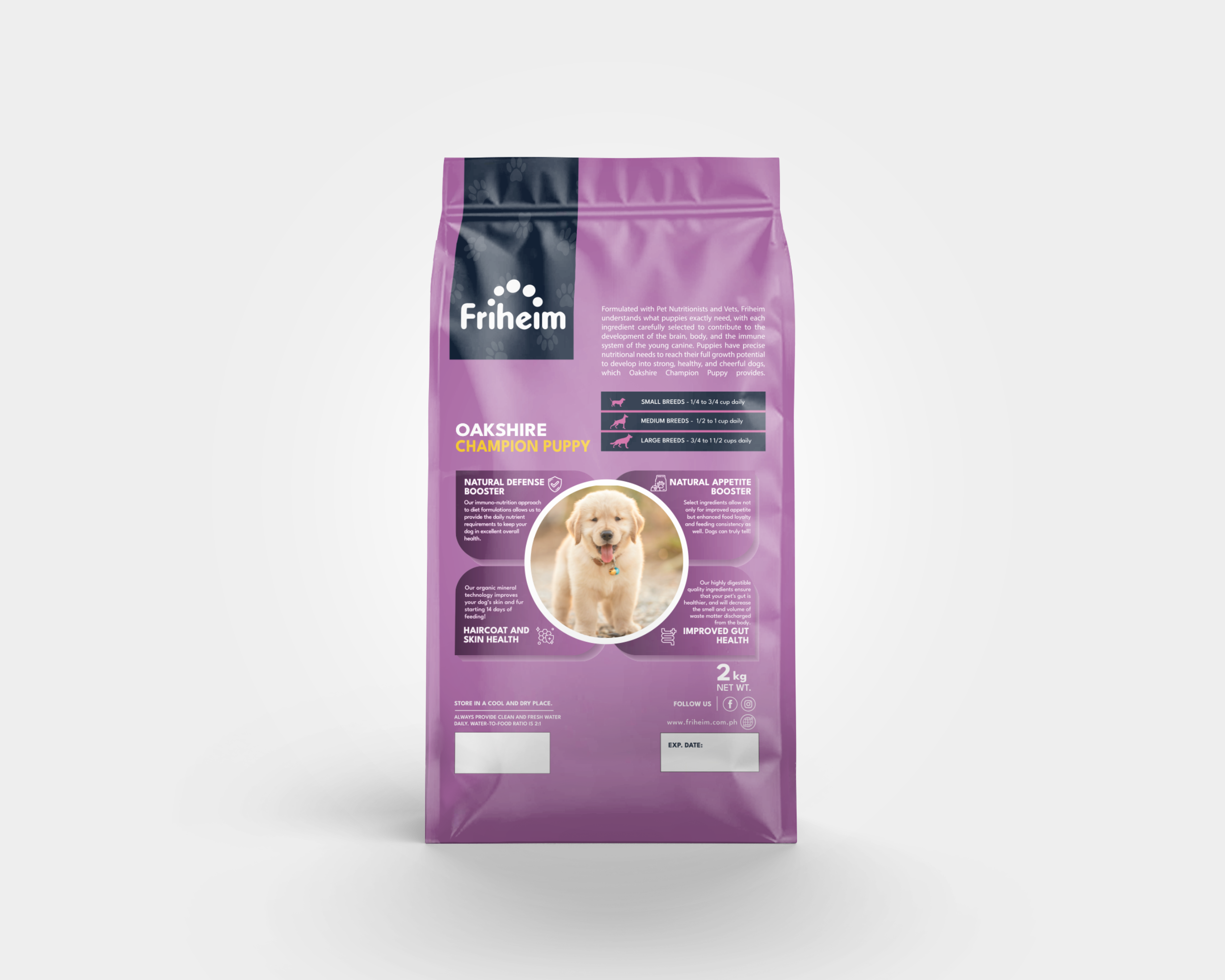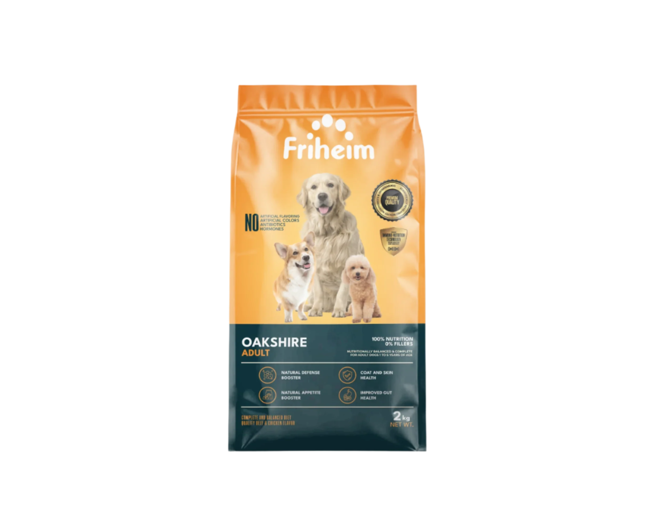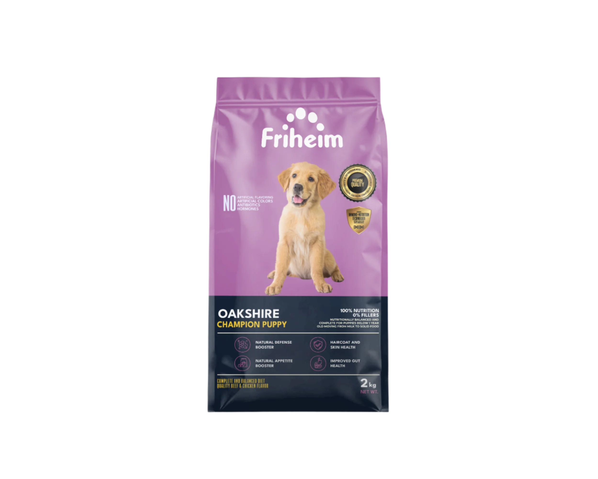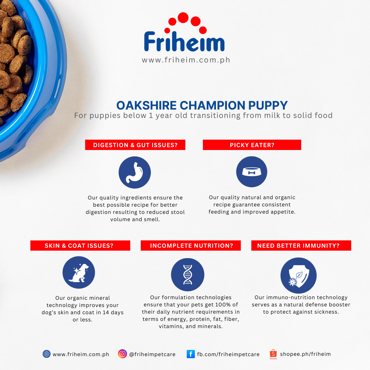 Yes! Friheim Oakshire dry kibble dog food is formulated for dogs of all breeds and sizes, ensuring they get the essential nutrients and protection against viruses and common diseases thanks to Friheim's proprietary Immuno-Nutrition Technology. Check the feeding guide in each product page of this website to find the appropriate life stage and right portion based on your dog's body weight.