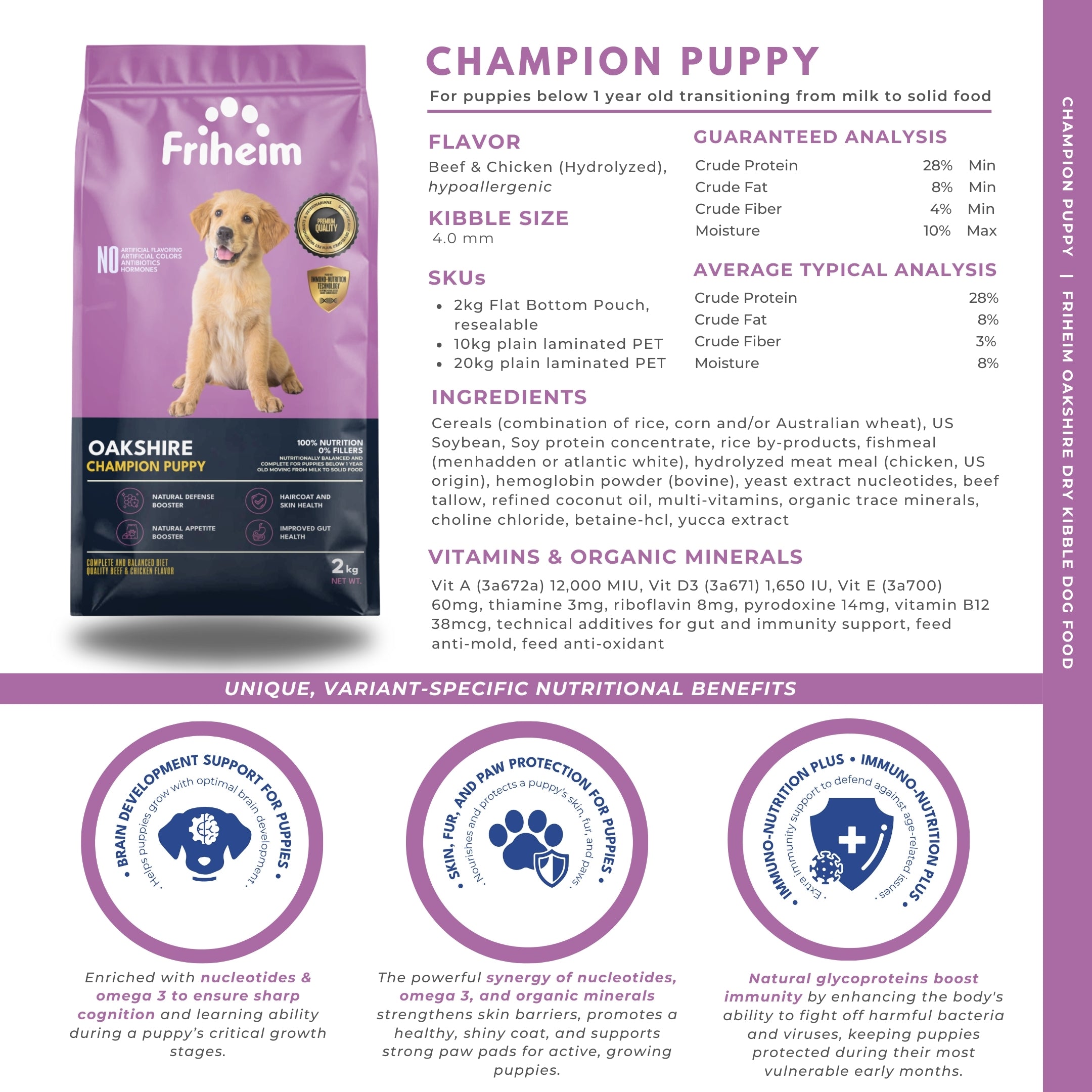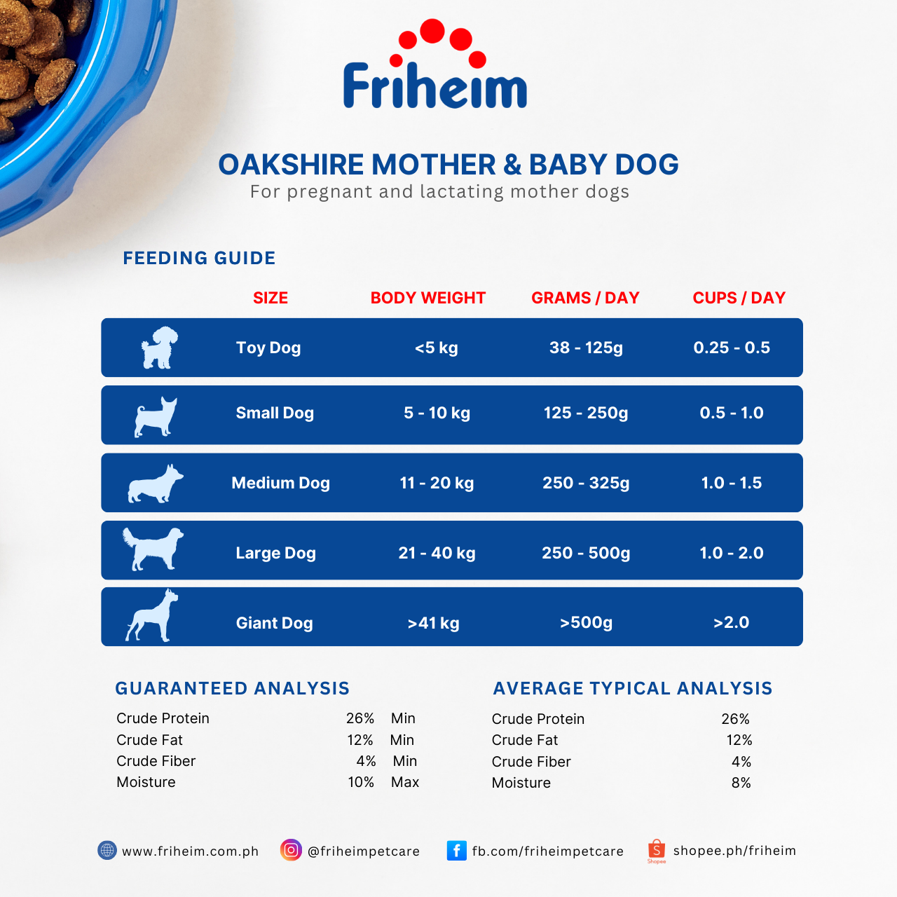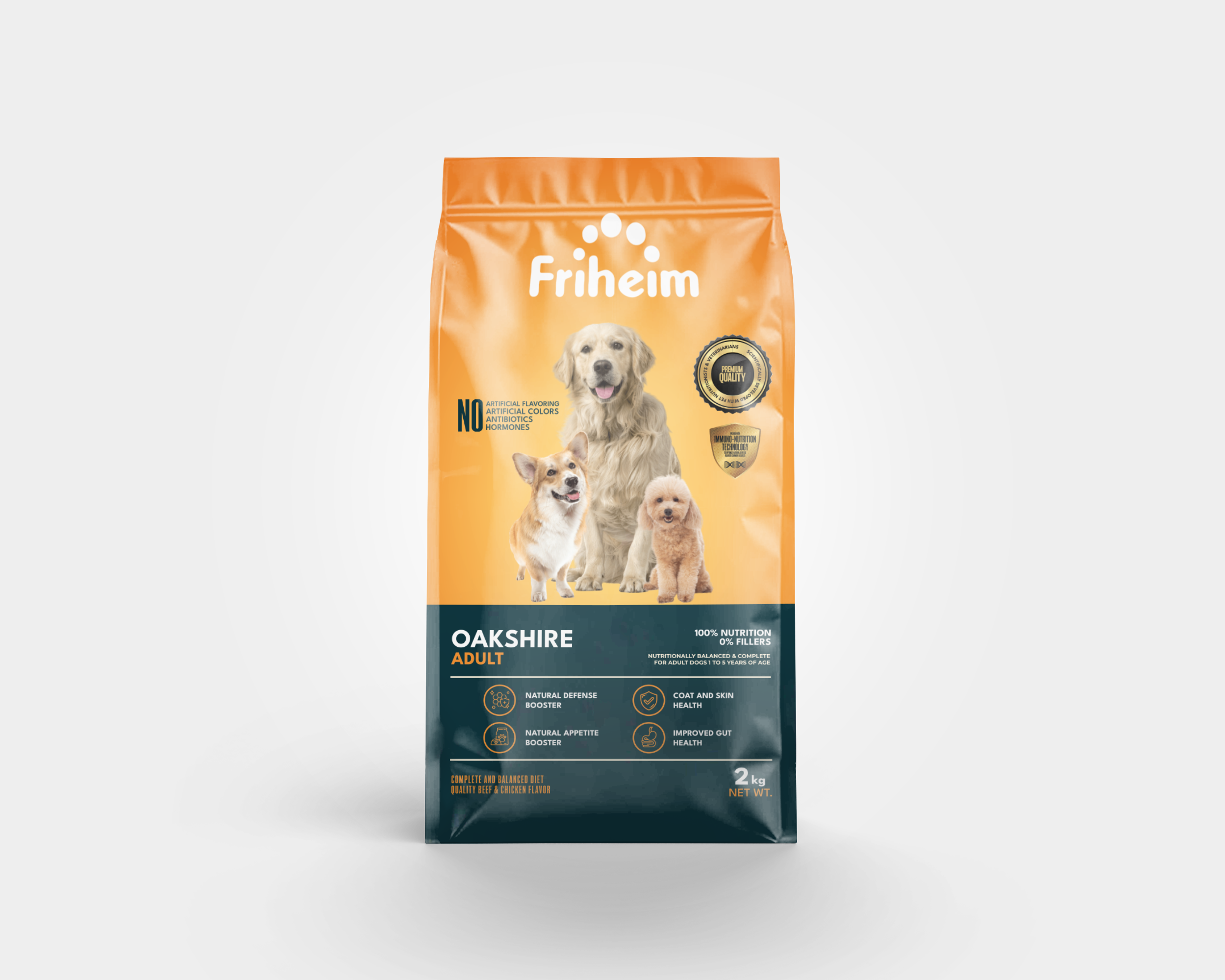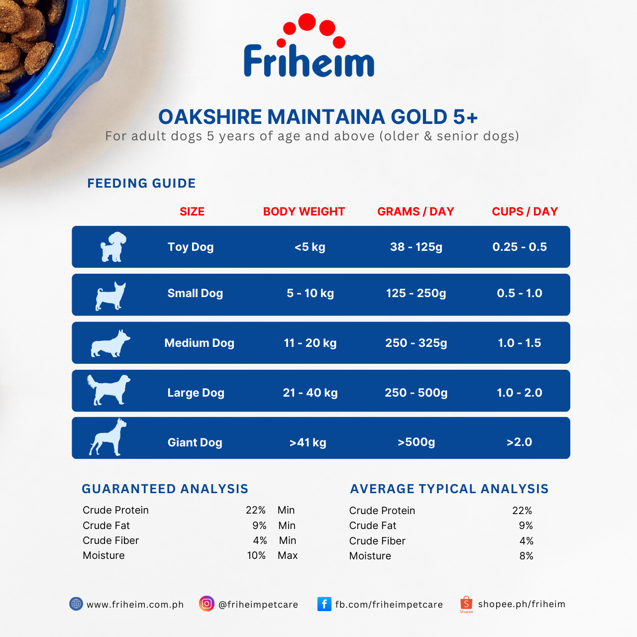 Yes! Friheim Oakshire dry kibble dog food is formulated for dogs of all breeds and sizes, ensuring they get the essential nutrients and protection against viruses and common diseases thanks to Friheim's proprietary Immuno-Nutrition Technology. Check the feeding guide in each product page of this website to find the appropriate life stage and right portion based on your dog's body weight.