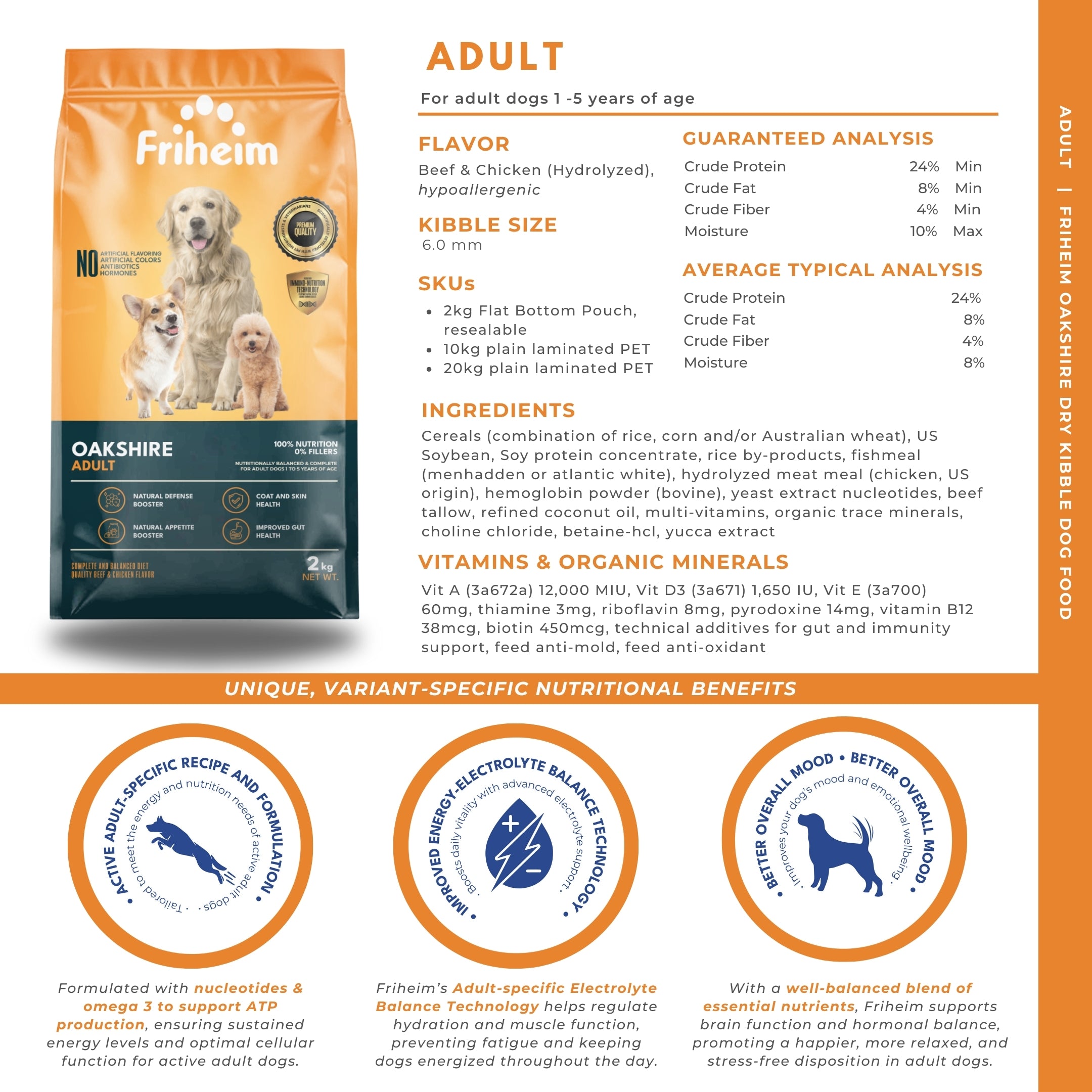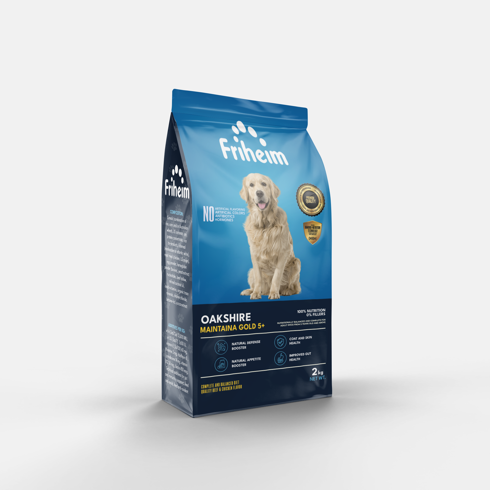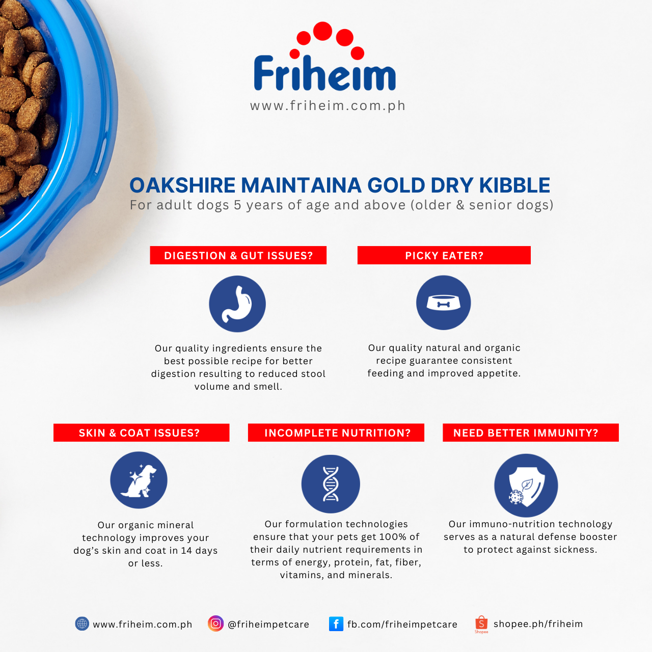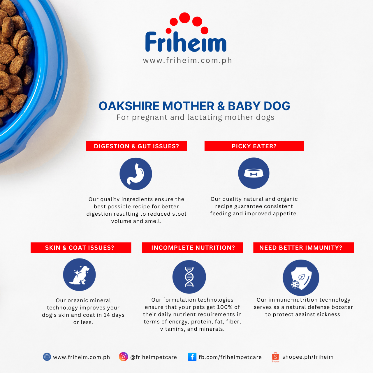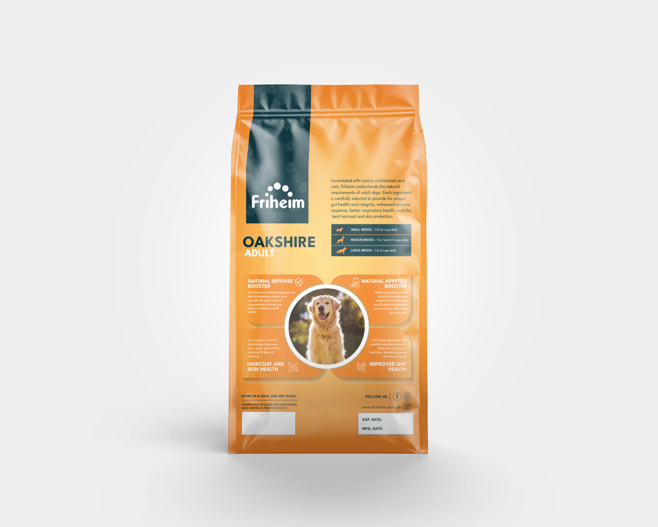 Yes! Friheim Oakshire dry kibble dog food is formulated for dogs of all breeds and sizes, ensuring they get the essential nutrients and protection against viruses and common diseases thanks to Friheim's proprietary Immuno-Nutrition Technology. Check the feeding guide in each product page of this website to find the appropriate life stage and right portion based on your dog's body weight.